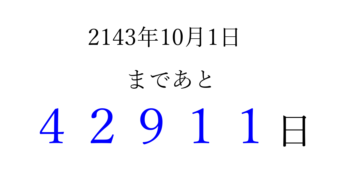 2143年10月1日(火)まで あと 99999 日です 追加すると、トップページからすぐ選べるようになります ※2026/04/06現在の結果です。 最新の状態に更新する ↓シェアして、タイムライン上にカウントダウンを表示しよう!↓ 📤 この結果を共有する Tweet シェア Threads Bluesky 別の日付でカウントダウン 2143年10月のカレンダー このページをブックマークに追加すると、いつでもカウントダウンを確認できます。 (PC: Ctrl+D / Mac: ⌘+D) hitome-notes.comでは以下のページも運営しています。 指定日と期間から日付を計算 | ガチャ確率計算・シミュレーション | プライバシー・ポリシー 運営者:Avocado