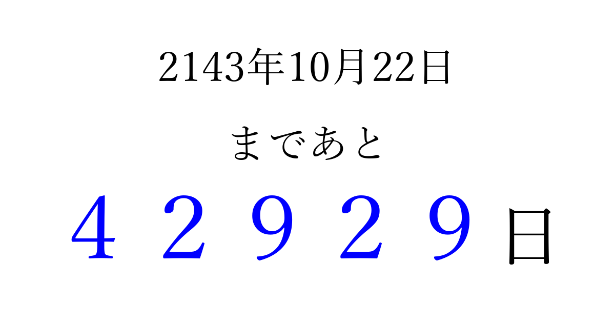 2143年10月22日(火)まで あと 99999 日です 追加すると、トップページからすぐ選べるようになります ※2026/04/09現在の結果です。 最新の状態に更新する ↓シェアして、タイムライン上にカウントダウンを表示しよう!↓ 📤 この結果を共有する Tweet シェア Threads Bluesky 別の日付でカウントダウン 2143年10月のカレンダー このページをブックマークに追加すると、いつでもカウントダウンを確認できます。 (PC: Ctrl+D / Mac: ⌘+D) hitome-notes.comでは以下のページも運営しています。 指定日と期間から日付を計算 | ガチャ確率計算・シミュレーション | プライバシー・ポリシー 運営者:Avocado