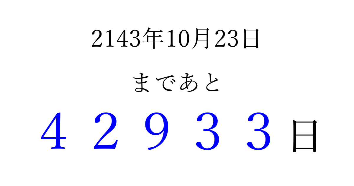 2143年10月23日(水)まで あと 99999 日です 追加すると、トップページからすぐ選べるようになります ※2026/04/06現在の結果です。 最新の状態に更新する ↓シェアして、タイムライン上にカウントダウンを表示しよう!↓ 📤 この結果を共有する Tweet シェア Threads Bluesky 別の日付でカウントダウン 2143年10月のカレンダー このページをブックマークに追加すると、いつでもカウントダウンを確認できます。 (PC: Ctrl+D / Mac: ⌘+D) hitome-notes.comでは以下のページも運営しています。 指定日と期間から日付を計算 | ガチャ確率計算・シミュレーション | プライバシー・ポリシー 運営者:Avocado