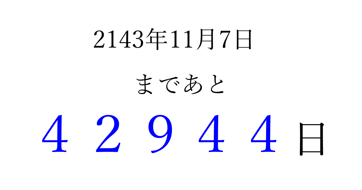 2143年11月7日(木)まで あと 99999 日です 追加すると、トップページからすぐ選べるようになります ※2026/04/10現在の結果です。 最新の状態に更新する ↓シェアして、タイムライン上にカウントダウンを表示しよう!↓ 📤 この結果を共有する Tweet シェア Threads Bluesky 別の日付でカウントダウン 2143年11月のカレンダー このページをブックマークに追加すると、いつでもカウントダウンを確認できます。 (PC: Ctrl+D / Mac: ⌘+D) hitome-notes.comでは以下のページも運営しています。 指定日と期間から日付を計算 | ガチャ確率計算・シミュレーション | プライバシー・ポリシー 運営者:Avocado