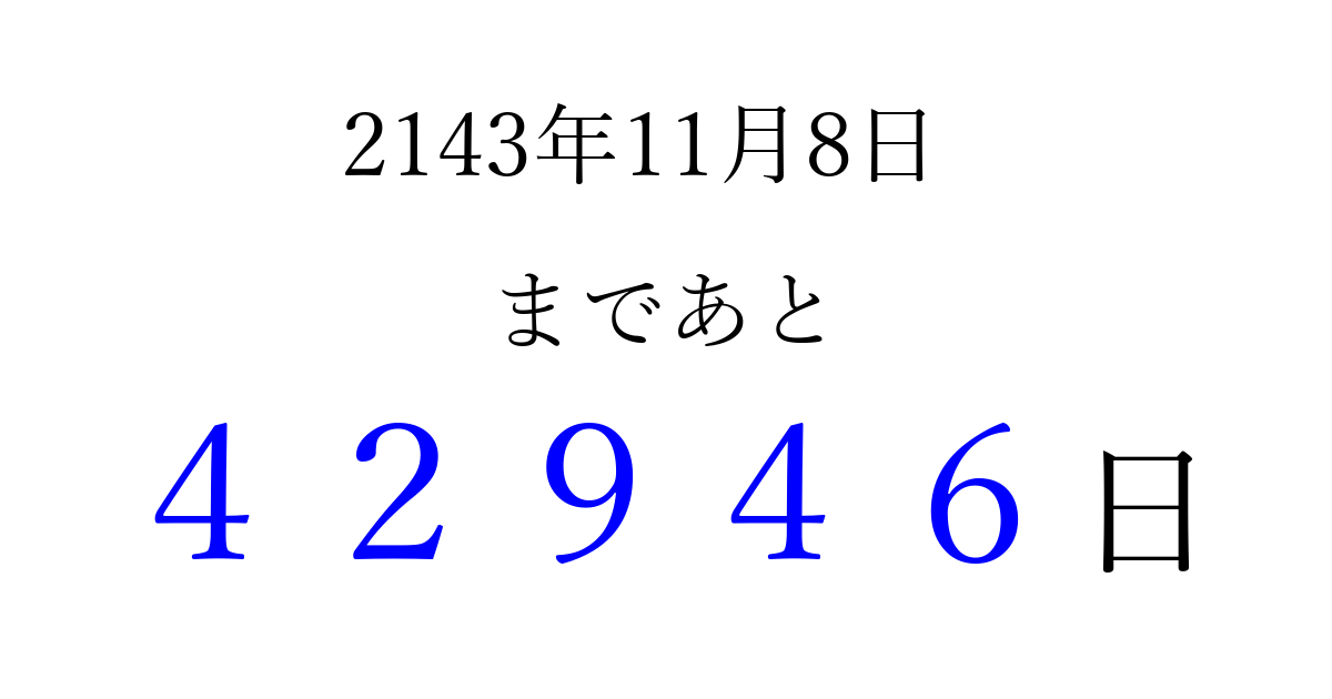 2143年11月8日(金)まで あと 99999 日です 追加すると、トップページからすぐ選べるようになります ※2026/04/09現在の結果です。 最新の状態に更新する ↓シェアして、タイムライン上にカウントダウンを表示しよう!↓ 📤 この結果を共有する Tweet シェア Threads Bluesky 別の日付でカウントダウン 2143年11月のカレンダー このページをブックマークに追加すると、いつでもカウントダウンを確認できます。 (PC: Ctrl+D / Mac: ⌘+D) hitome-notes.comでは以下のページも運営しています。 指定日と期間から日付を計算 | ガチャ確率計算・シミュレーション | プライバシー・ポリシー 運営者:Avocado