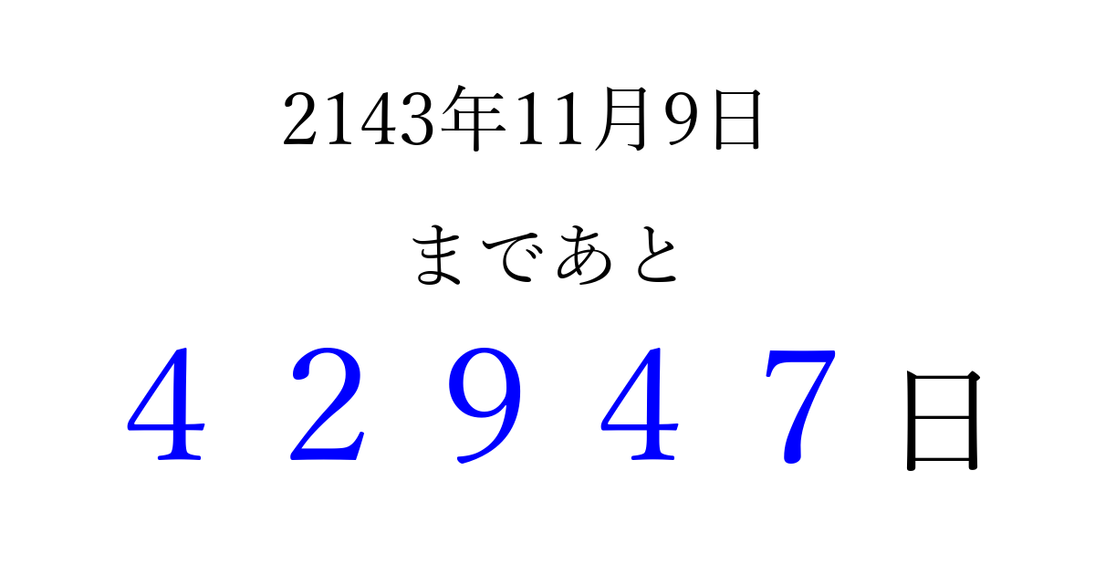 2143年11月9日(土)まで あと 99999 日です 追加すると、トップページからすぐ選べるようになります ※2026/04/09現在の結果です。 最新の状態に更新する ↓シェアして、タイムライン上にカウントダウンを表示しよう!↓ 📤 この結果を共有する Tweet シェア Threads Bluesky 別の日付でカウントダウン 2143年11月のカレンダー このページをブックマークに追加すると、いつでもカウントダウンを確認できます。 (PC: Ctrl+D / Mac: ⌘+D) hitome-notes.comでは以下のページも運営しています。 指定日と期間から日付を計算 | ガチャ確率計算・シミュレーション | プライバシー・ポリシー 運営者:Avocado