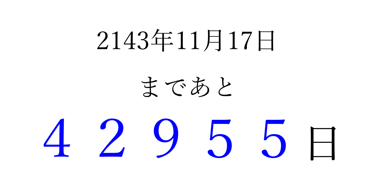 2143年11月17日(日)まで あと 99999 日です 追加すると、トップページからすぐ選べるようになります ※2026/04/09現在の結果です。 最新の状態に更新する ↓シェアして、タイムライン上にカウントダウンを表示しよう!↓ 📤 この結果を共有する Tweet シェア Threads Bluesky 別の日付でカウントダウン 2143年11月のカレンダー このページをブックマークに追加すると、いつでもカウントダウンを確認できます。 (PC: Ctrl+D / Mac: ⌘+D) hitome-notes.comでは以下のページも運営しています。 指定日と期間から日付を計算 | ガチャ確率計算・シミュレーション | プライバシー・ポリシー 運営者:Avocado