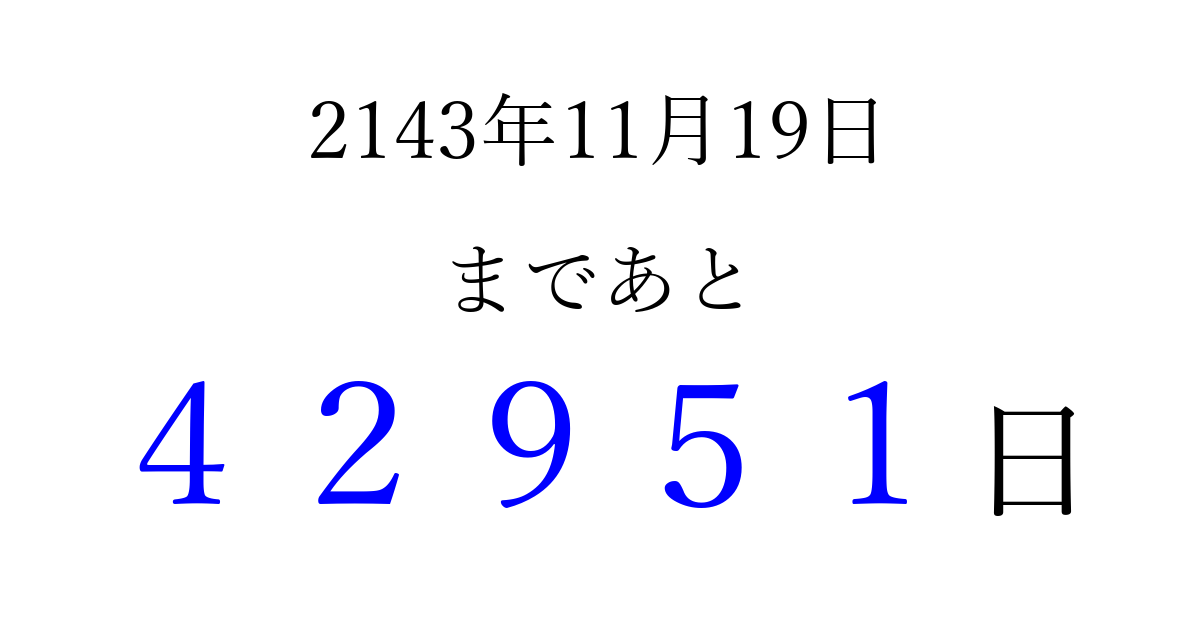 2143年11月19日(火)まで あと 99999 日です 追加すると、トップページからすぐ選べるようになります ※2026/04/15現在の結果です。 最新の状態に更新する ↓シェアして、タイムライン上にカウントダウンを表示しよう!↓ 📤 この結果を共有する Tweet シェア Threads Bluesky 別の日付でカウントダウン 2143年11月のカレンダー このページをブックマークに追加すると、いつでもカウントダウンを確認できます。 (PC: Ctrl+D / Mac: ⌘+D) hitome-notes.comでは以下のページも運営しています。 指定日と期間から日付を計算 | ガチャ確率計算・シミュレーション | プライバシー・ポリシー 運営者:Avocado