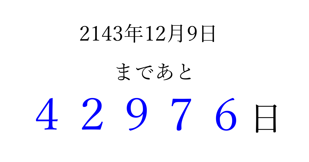 2143年12月9日(月)まで あと 99999 日です 追加すると、トップページからすぐ選べるようになります ※2026/04/10現在の結果です。 最新の状態に更新する ↓シェアして、タイムライン上にカウントダウンを表示しよう!↓ 📤 この結果を共有する Tweet シェア Threads Bluesky 別の日付でカウントダウン 2143年12月のカレンダー このページをブックマークに追加すると、いつでもカウントダウンを確認できます。 (PC: Ctrl+D / Mac: ⌘+D) hitome-notes.comでは以下のページも運営しています。 指定日と期間から日付を計算 | ガチャ確率計算・シミュレーション | プライバシー・ポリシー 運営者:Avocado