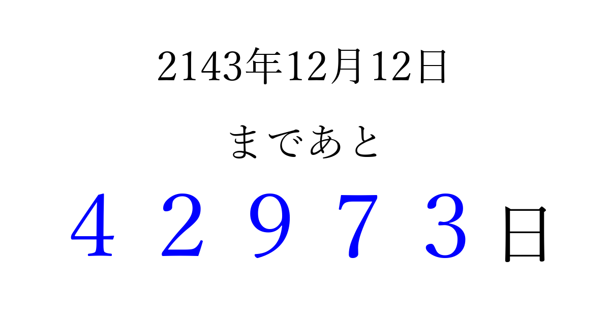 2143年12月12日(木)まで あと 99999 日です 追加すると、トップページからすぐ選べるようになります ※2026/04/16現在の結果です。 最新の状態に更新する ↓シェアして、タイムライン上にカウントダウンを表示しよう!↓ 📤 この結果を共有する Tweet シェア Threads Bluesky 別の日付でカウントダウン 2143年12月のカレンダー このページをブックマークに追加すると、いつでもカウントダウンを確認できます。 (PC: Ctrl+D / Mac: ⌘+D) hitome-notes.comでは以下のページも運営しています。 指定日と期間から日付を計算 | ガチャ確率計算・シミュレーション | プライバシー・ポリシー 運営者:Avocado