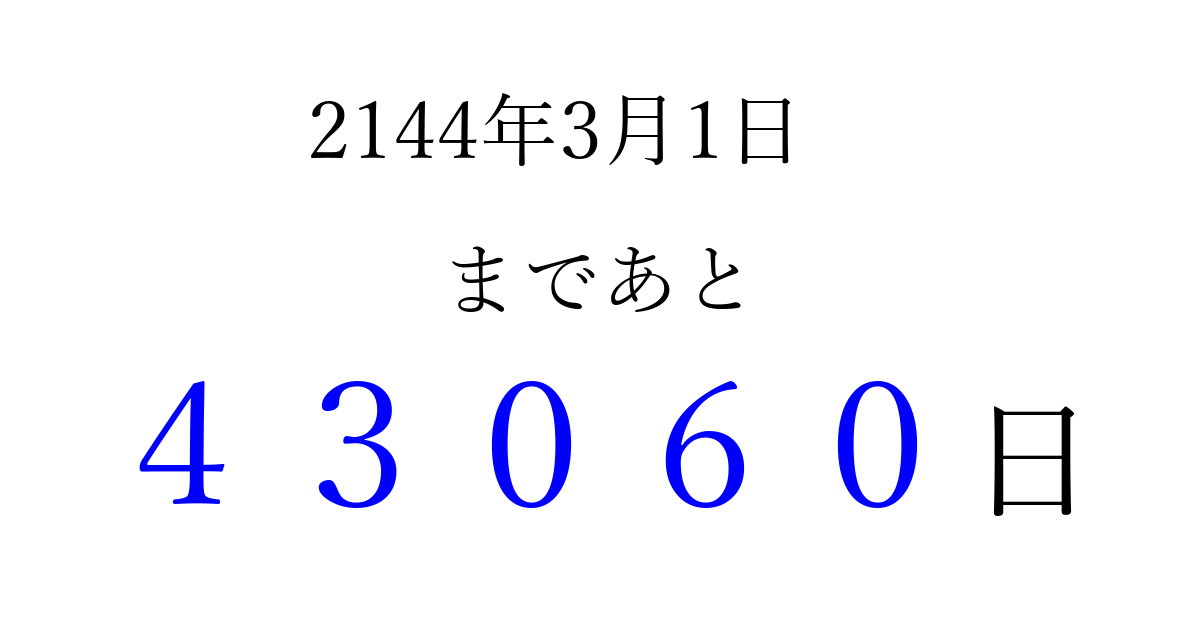 2144年3月1日(日)まで あと 99999 日です 追加すると、トップページからすぐ選べるようになります ※2026/04/09現在の結果です。 最新の状態に更新する ↓シェアして、タイムライン上にカウントダウンを表示しよう!↓ 📤 この結果を共有する Tweet シェア Threads Bluesky 別の日付でカウントダウン 2144年3月のカレンダー このページをブックマークに追加すると、いつでもカウントダウンを確認できます。 (PC: Ctrl+D / Mac: ⌘+D) hitome-notes.comでは以下のページも運営しています。 指定日と期間から日付を計算 | ガチャ確率計算・シミュレーション | プライバシー・ポリシー 運営者:Avocado