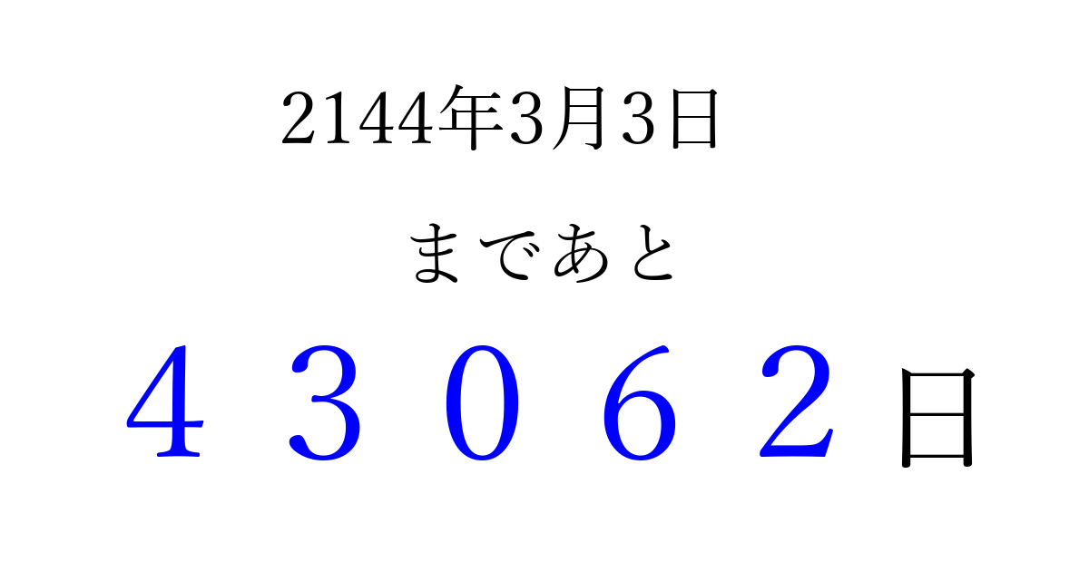 2144年3月3日(火)まで あと 99999 日です 追加すると、トップページからすぐ選べるようになります ※2026/04/09現在の結果です。 最新の状態に更新する ↓シェアして、タイムライン上にカウントダウンを表示しよう!↓ 📤 この結果を共有する Tweet シェア Threads Bluesky 別の日付でカウントダウン 2144年3月のカレンダー このページをブックマークに追加すると、いつでもカウントダウンを確認できます。 (PC: Ctrl+D / Mac: ⌘+D) hitome-notes.comでは以下のページも運営しています。 指定日と期間から日付を計算 | ガチャ確率計算・シミュレーション | プライバシー・ポリシー 運営者:Avocado
