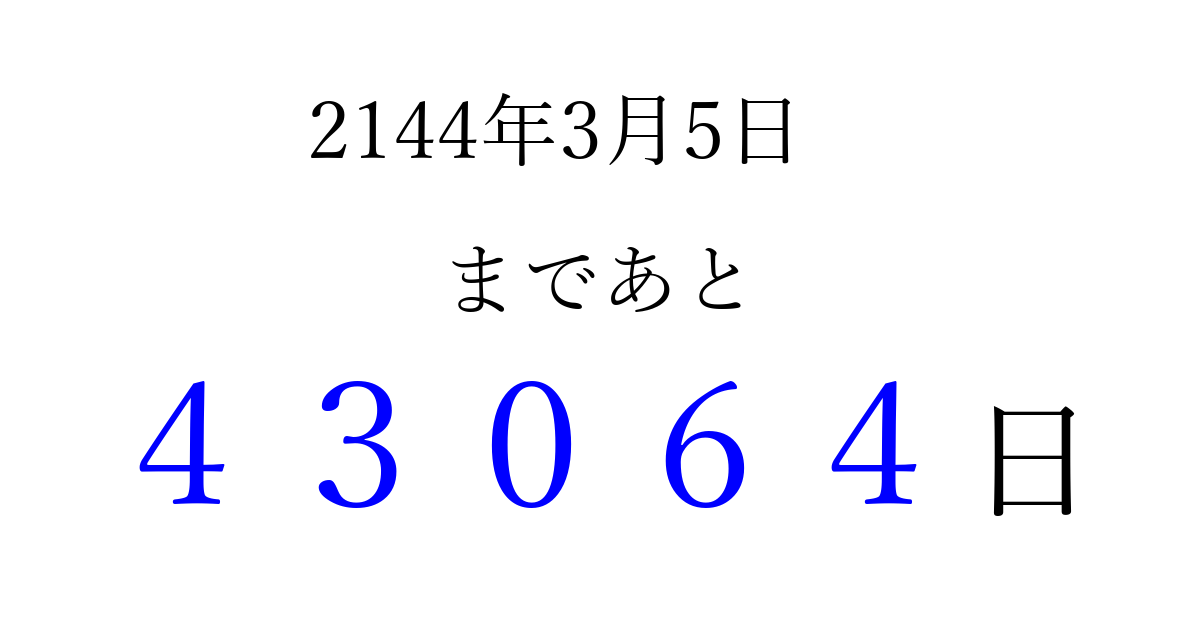 2144年3月5日(木)まで あと 99999 日です 追加すると、トップページからすぐ選べるようになります ※2026/04/09現在の結果です。 最新の状態に更新する ↓シェアして、タイムライン上にカウントダウンを表示しよう!↓ 📤 この結果を共有する Tweet シェア Threads Bluesky 別の日付でカウントダウン 2144年3月のカレンダー このページをブックマークに追加すると、いつでもカウントダウンを確認できます。 (PC: Ctrl+D / Mac: ⌘+D) hitome-notes.comでは以下のページも運営しています。 指定日と期間から日付を計算 | ガチャ確率計算・シミュレーション | プライバシー・ポリシー 運営者:Avocado