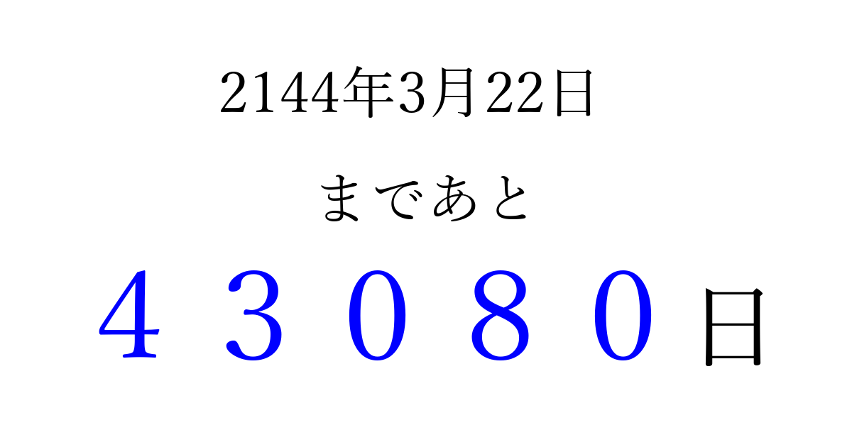 2144年3月22日(日)まで あと 99999 日です 追加すると、トップページからすぐ選べるようになります ※2026/04/10現在の結果です。 最新の状態に更新する ↓シェアして、タイムライン上にカウントダウンを表示しよう!↓ 📤 この結果を共有する Tweet シェア Threads Bluesky 別の日付でカウントダウン 2144年3月のカレンダー このページをブックマークに追加すると、いつでもカウントダウンを確認できます。 (PC: Ctrl+D / Mac: ⌘+D) hitome-notes.comでは以下のページも運営しています。 指定日と期間から日付を計算 | ガチャ確率計算・シミュレーション | プライバシー・ポリシー 運営者:Avocado