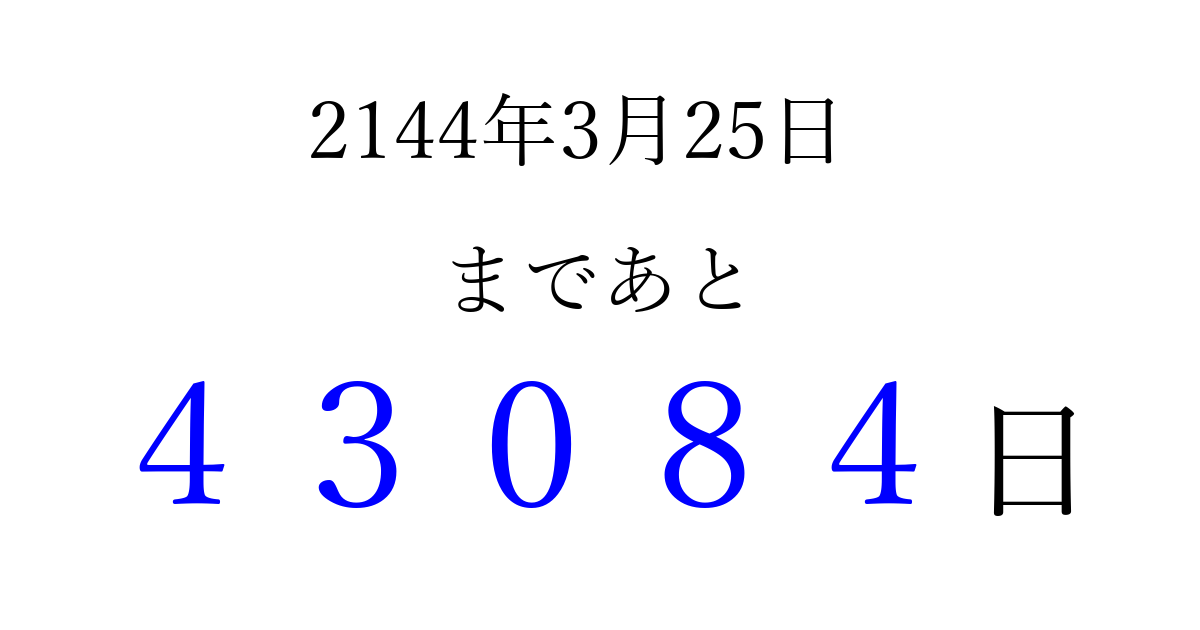 2144年3月25日(水)まで あと 99999 日です 追加すると、トップページからすぐ選べるようになります ※2026/04/09現在の結果です。 最新の状態に更新する ↓シェアして、タイムライン上にカウントダウンを表示しよう!↓ 📤 この結果を共有する Tweet シェア Threads Bluesky 別の日付でカウントダウン 2144年3月のカレンダー このページをブックマークに追加すると、いつでもカウントダウンを確認できます。 (PC: Ctrl+D / Mac: ⌘+D) hitome-notes.comでは以下のページも運営しています。 指定日と期間から日付を計算 | ガチャ確率計算・シミュレーション | プライバシー・ポリシー 運営者:Avocado