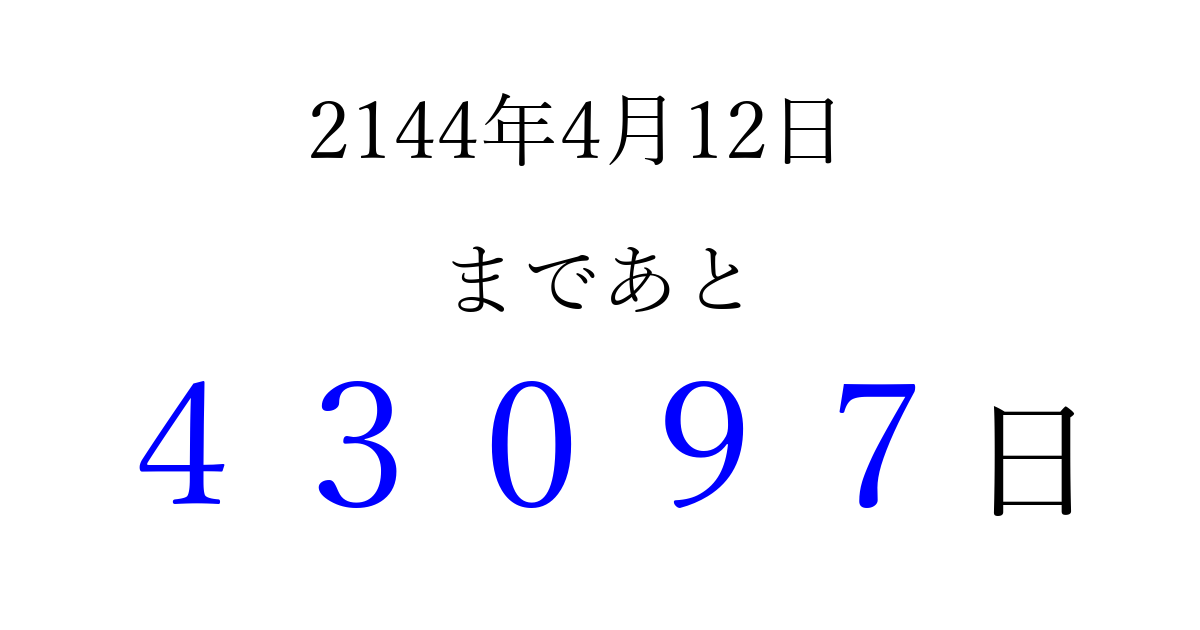 2144年4月12日(日)まで あと 99999 日です 追加すると、トップページからすぐ選べるようになります ※2026/04/14現在の結果です。 最新の状態に更新する ↓シェアして、タイムライン上にカウントダウンを表示しよう!↓ 📤 この結果を共有する Tweet シェア Threads Bluesky 別の日付でカウントダウン 2144年4月のカレンダー このページをブックマークに追加すると、いつでもカウントダウンを確認できます。 (PC: Ctrl+D / Mac: ⌘+D) hitome-notes.comでは以下のページも運営しています。 指定日と期間から日付を計算 | ガチャ確率計算・シミュレーション | プライバシー・ポリシー 運営者:Avocado