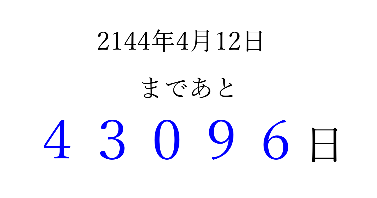 2144年4月12日(日)まで あと 99999 日です 追加すると、トップページからすぐ選べるようになります ※2026/04/15現在の結果です。 最新の状態に更新する ↓シェアして、タイムライン上にカウントダウンを表示しよう!↓ 📤 この結果を共有する Tweet シェア Threads Bluesky 別の日付でカウントダウン 2144年4月のカレンダー このページをブックマークに追加すると、いつでもカウントダウンを確認できます。 (PC: Ctrl+D / Mac: ⌘+D) hitome-notes.comでは以下のページも運営しています。 指定日と期間から日付を計算 | ガチャ確率計算・シミュレーション | プライバシー・ポリシー 運営者:Avocado
