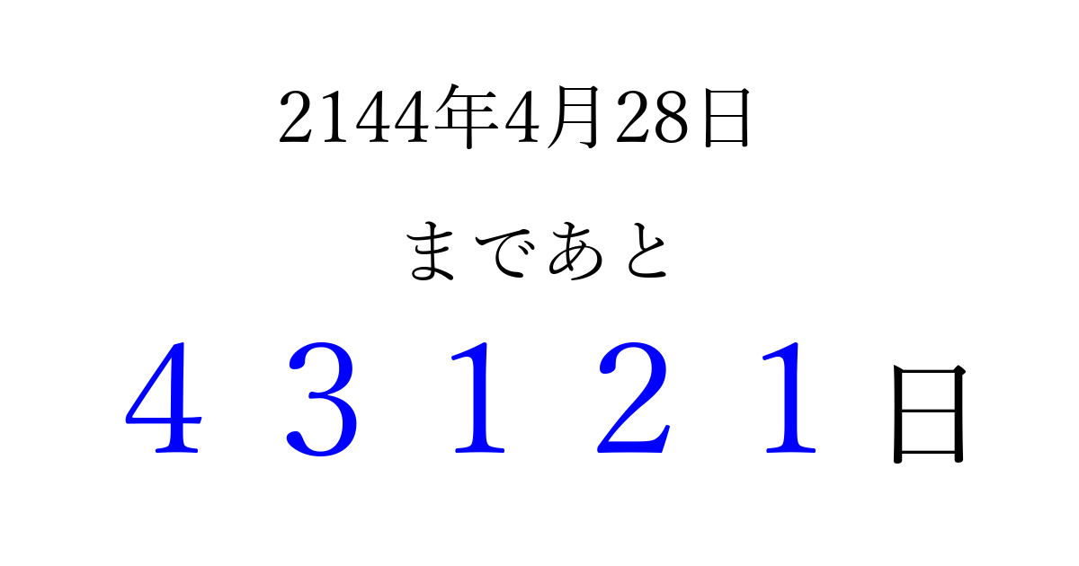 2144年4月28日(火)まで あと 99999 日です 追加すると、トップページからすぐ選べるようになります ※2026/04/06現在の結果です。 最新の状態に更新する ↓シェアして、タイムライン上にカウントダウンを表示しよう!↓ 📤 この結果を共有する Tweet シェア Threads Bluesky 別の日付でカウントダウン 2144年4月のカレンダー このページをブックマークに追加すると、いつでもカウントダウンを確認できます。 (PC: Ctrl+D / Mac: ⌘+D) hitome-notes.comでは以下のページも運営しています。 指定日と期間から日付を計算 | ガチャ確率計算・シミュレーション | プライバシー・ポリシー 運営者:Avocado