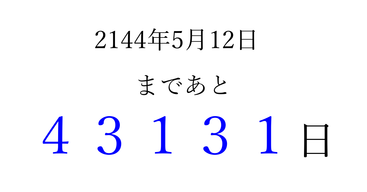 2144年5月12日(火)まで あと 99999 日です 追加すると、トップページからすぐ選べるようになります ※2026/04/10現在の結果です。 最新の状態に更新する ↓シェアして、タイムライン上にカウントダウンを表示しよう!↓ 📤 この結果を共有する Tweet シェア Threads Bluesky 別の日付でカウントダウン 2144年5月のカレンダー このページをブックマークに追加すると、いつでもカウントダウンを確認できます。 (PC: Ctrl+D / Mac: ⌘+D) hitome-notes.comでは以下のページも運営しています。 指定日と期間から日付を計算 | ガチャ確率計算・シミュレーション | プライバシー・ポリシー 運営者:Avocado