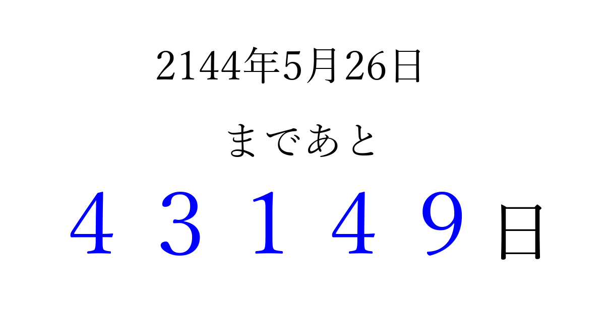 2144年5月26日(火)まで あと 99999 日です 追加すると、トップページからすぐ選べるようになります ※2026/04/06現在の結果です。 最新の状態に更新する ↓シェアして、タイムライン上にカウントダウンを表示しよう!↓ 📤 この結果を共有する Tweet シェア Threads Bluesky 別の日付でカウントダウン 2144年5月のカレンダー このページをブックマークに追加すると、いつでもカウントダウンを確認できます。 (PC: Ctrl+D / Mac: ⌘+D) hitome-notes.comでは以下のページも運営しています。 指定日と期間から日付を計算 | ガチャ確率計算・シミュレーション | プライバシー・ポリシー 運営者:Avocado