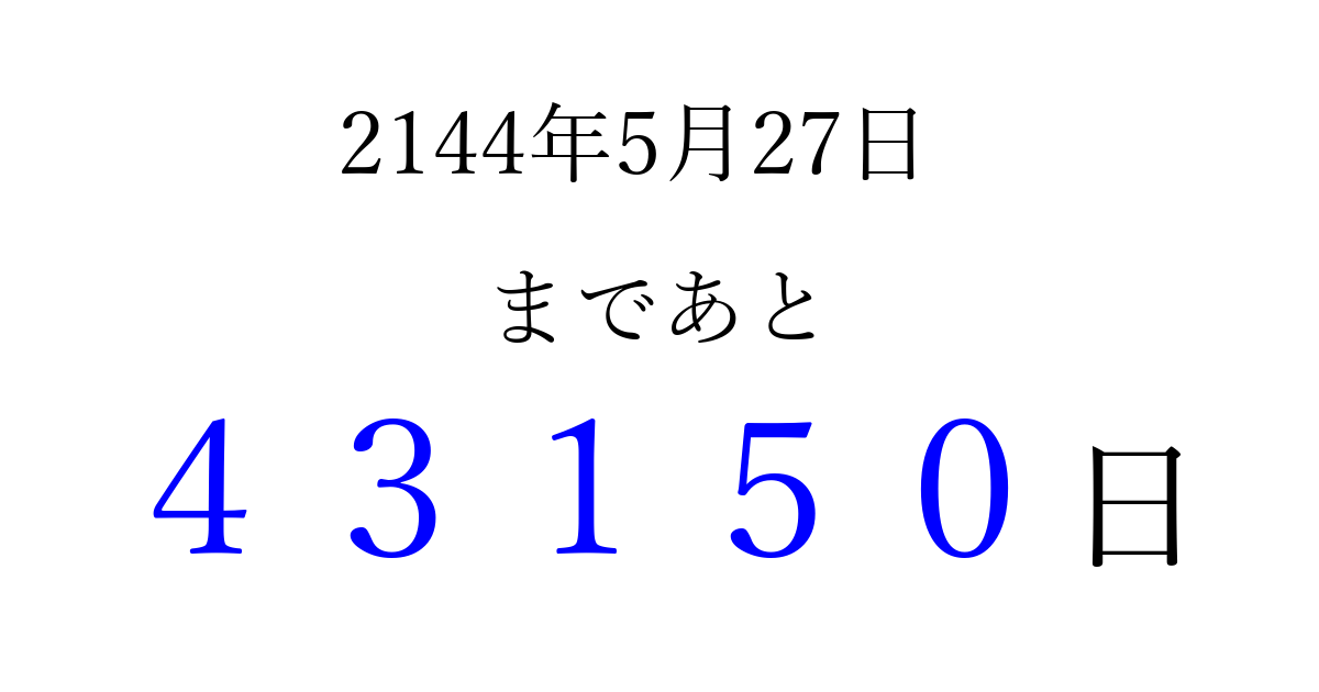 2144年5月27日(水)まで あと 99999 日です 追加すると、トップページからすぐ選べるようになります ※2026/04/06現在の結果です。 最新の状態に更新する ↓シェアして、タイムライン上にカウントダウンを表示しよう!↓ 📤 この結果を共有する Tweet シェア Threads Bluesky 別の日付でカウントダウン 2144年5月のカレンダー このページをブックマークに追加すると、いつでもカウントダウンを確認できます。 (PC: Ctrl+D / Mac: ⌘+D) hitome-notes.comでは以下のページも運営しています。 指定日と期間から日付を計算 | ガチャ確率計算・シミュレーション | プライバシー・ポリシー 運営者:Avocado