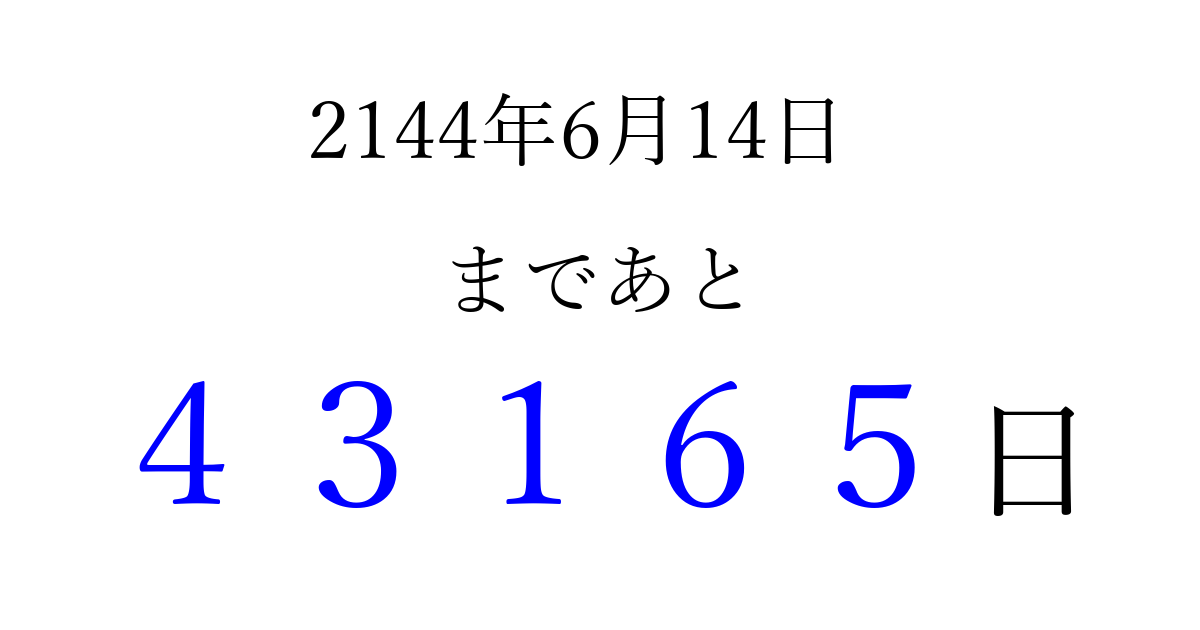 2144年6月14日(日)まで あと 99999 日です 追加すると、トップページからすぐ選べるようになります ※2026/04/09現在の結果です。 最新の状態に更新する ↓シェアして、タイムライン上にカウントダウンを表示しよう!↓ 📤 この結果を共有する Tweet シェア Threads Bluesky 別の日付でカウントダウン 2144年6月のカレンダー このページをブックマークに追加すると、いつでもカウントダウンを確認できます。 (PC: Ctrl+D / Mac: ⌘+D) hitome-notes.comでは以下のページも運営しています。 指定日と期間から日付を計算 | ガチャ確率計算・シミュレーション | プライバシー・ポリシー 運営者:Avocado