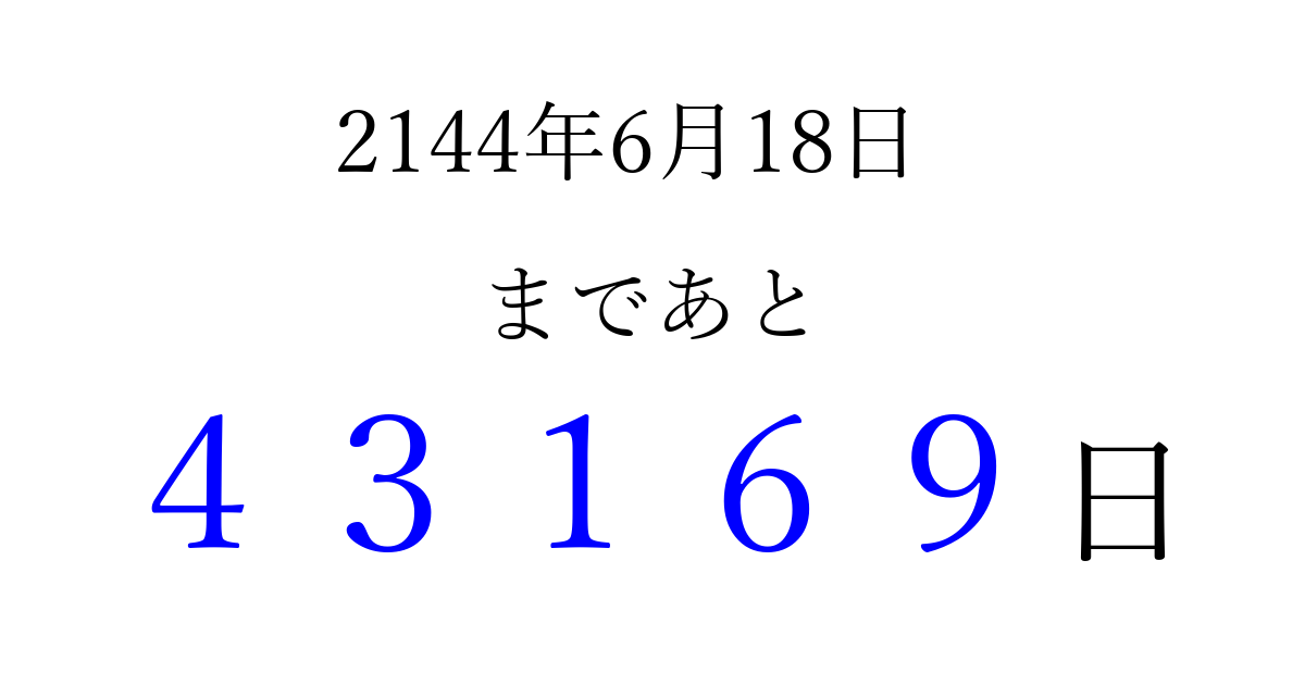 2144年6月18日(木)まで あと 99999 日です 追加すると、トップページからすぐ選べるようになります ※2026/04/09現在の結果です。 最新の状態に更新する ↓シェアして、タイムライン上にカウントダウンを表示しよう!↓ 📤 この結果を共有する Tweet シェア Threads Bluesky 別の日付でカウントダウン 2144年6月のカレンダー このページをブックマークに追加すると、いつでもカウントダウンを確認できます。 (PC: Ctrl+D / Mac: ⌘+D) hitome-notes.comでは以下のページも運営しています。 指定日と期間から日付を計算 | ガチャ確率計算・シミュレーション | プライバシー・ポリシー 運営者:Avocado