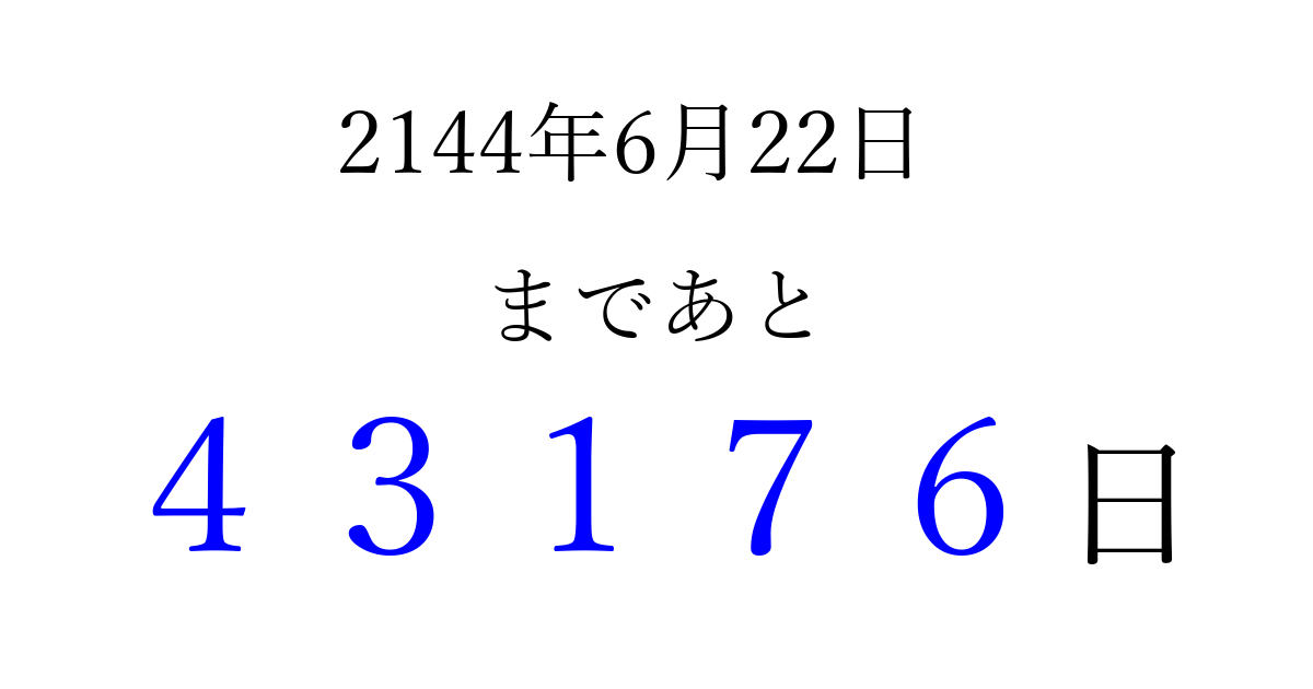 2144年6月22日(月)まで あと 99999 日です 追加すると、トップページからすぐ選べるようになります ※2026/04/06現在の結果です。 最新の状態に更新する ↓シェアして、タイムライン上にカウントダウンを表示しよう!↓ 📤 この結果を共有する Tweet シェア Threads Bluesky 別の日付でカウントダウン 2144年6月のカレンダー このページをブックマークに追加すると、いつでもカウントダウンを確認できます。 (PC: Ctrl+D / Mac: ⌘+D) hitome-notes.comでは以下のページも運営しています。 指定日と期間から日付を計算 | ガチャ確率計算・シミュレーション | プライバシー・ポリシー 運営者:Avocado