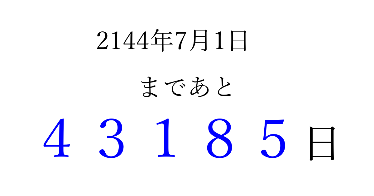 2144年7月1日(水)まで あと 99999 日です 追加すると、トップページからすぐ選べるようになります ※2026/04/06現在の結果です。 最新の状態に更新する ↓シェアして、タイムライン上にカウントダウンを表示しよう!↓ 📤 この結果を共有する Tweet シェア Threads Bluesky 別の日付でカウントダウン 2144年7月のカレンダー このページをブックマークに追加すると、いつでもカウントダウンを確認できます。 (PC: Ctrl+D / Mac: ⌘+D) hitome-notes.comでは以下のページも運営しています。 指定日と期間から日付を計算 | ガチャ確率計算・シミュレーション | プライバシー・ポリシー 運営者:Avocado