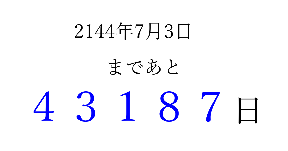 2144年7月3日(金)まで あと 99999 日です 追加すると、トップページからすぐ選べるようになります ※2026/04/06現在の結果です。 最新の状態に更新する ↓シェアして、タイムライン上にカウントダウンを表示しよう!↓ 📤 この結果を共有する Tweet シェア Threads Bluesky 別の日付でカウントダウン 2144年7月のカレンダー このページをブックマークに追加すると、いつでもカウントダウンを確認できます。 (PC: Ctrl+D / Mac: ⌘+D) hitome-notes.comでは以下のページも運営しています。 指定日と期間から日付を計算 | ガチャ確率計算・シミュレーション | プライバシー・ポリシー 運営者:Avocado
