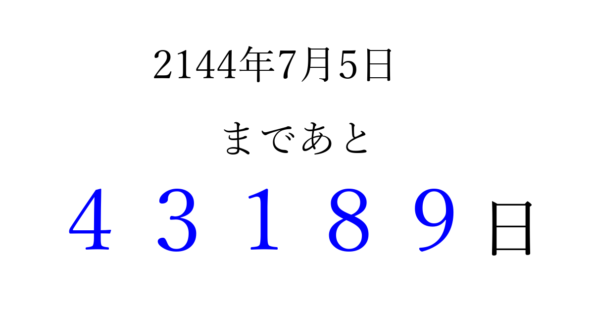 2144年7月5日(日)まで あと 99999 日です 追加すると、トップページからすぐ選べるようになります ※2026/04/06現在の結果です。 最新の状態に更新する ↓シェアして、タイムライン上にカウントダウンを表示しよう!↓ 📤 この結果を共有する Tweet シェア Threads Bluesky 別の日付でカウントダウン 2144年7月のカレンダー このページをブックマークに追加すると、いつでもカウントダウンを確認できます。 (PC: Ctrl+D / Mac: ⌘+D) hitome-notes.comでは以下のページも運営しています。 指定日と期間から日付を計算 | ガチャ確率計算・シミュレーション | プライバシー・ポリシー 運営者:Avocado
