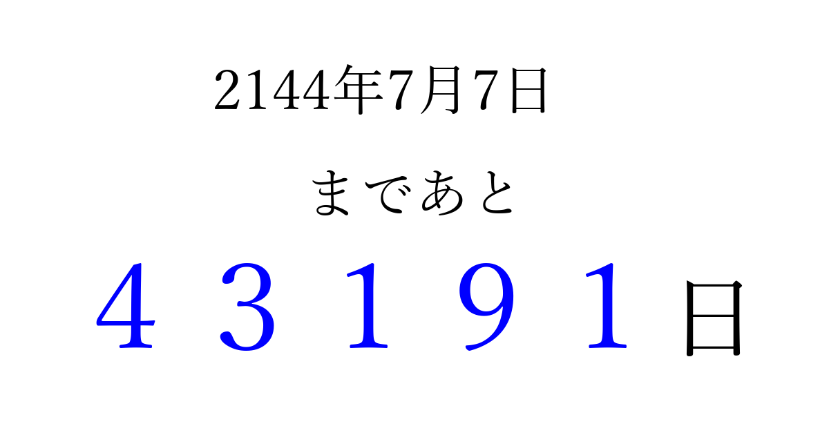 2144年7月7日(火)まで あと 99999 日です 追加すると、トップページからすぐ選べるようになります ※2026/04/06現在の結果です。 最新の状態に更新する ↓シェアして、タイムライン上にカウントダウンを表示しよう!↓ 📤 この結果を共有する Tweet シェア Threads Bluesky 別の日付でカウントダウン 2144年7月のカレンダー このページをブックマークに追加すると、いつでもカウントダウンを確認できます。 (PC: Ctrl+D / Mac: ⌘+D) hitome-notes.comでは以下のページも運営しています。 指定日と期間から日付を計算 | ガチャ確率計算・シミュレーション | プライバシー・ポリシー 運営者:Avocado