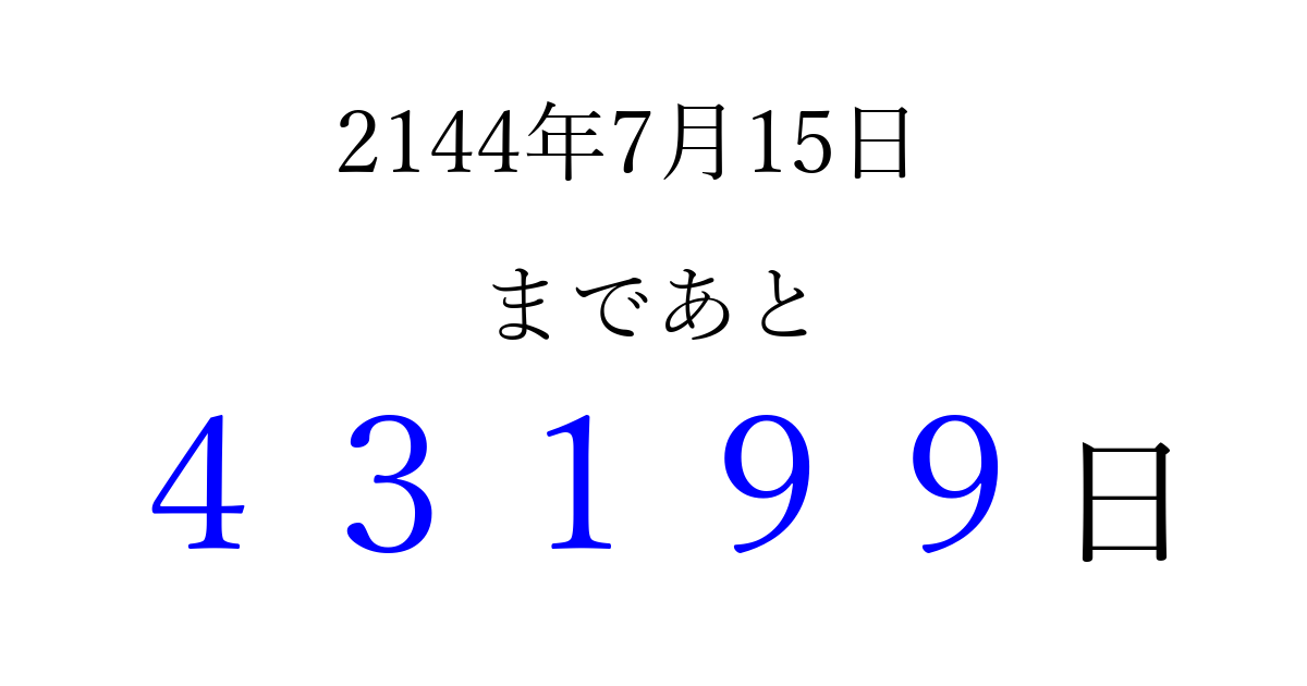 2144年7月15日(水)まで あと 99999 日です 追加すると、トップページからすぐ選べるようになります ※2026/04/06現在の結果です。 最新の状態に更新する ↓シェアして、タイムライン上にカウントダウンを表示しよう!↓ 📤 この結果を共有する Tweet シェア Threads Bluesky 別の日付でカウントダウン 2144年7月のカレンダー このページをブックマークに追加すると、いつでもカウントダウンを確認できます。 (PC: Ctrl+D / Mac: ⌘+D) hitome-notes.comでは以下のページも運営しています。 指定日と期間から日付を計算 | ガチャ確率計算・シミュレーション | プライバシー・ポリシー 運営者:Avocado