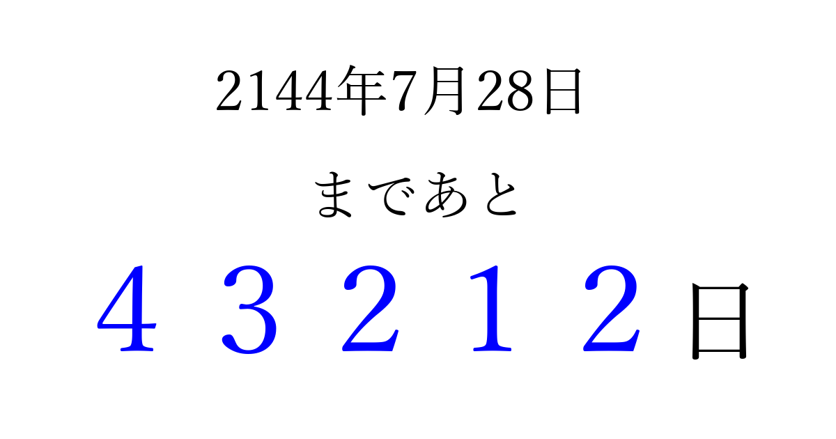 2144年7月28日(火)まで あと 99999 日です 追加すると、トップページからすぐ選べるようになります ※2026/04/06現在の結果です。 最新の状態に更新する ↓シェアして、タイムライン上にカウントダウンを表示しよう!↓ 📤 この結果を共有する Tweet シェア Threads Bluesky 別の日付でカウントダウン 2144年7月のカレンダー このページをブックマークに追加すると、いつでもカウントダウンを確認できます。 (PC: Ctrl+D / Mac: ⌘+D) hitome-notes.comでは以下のページも運営しています。 指定日と期間から日付を計算 | ガチャ確率計算・シミュレーション | プライバシー・ポリシー 運営者:Avocado