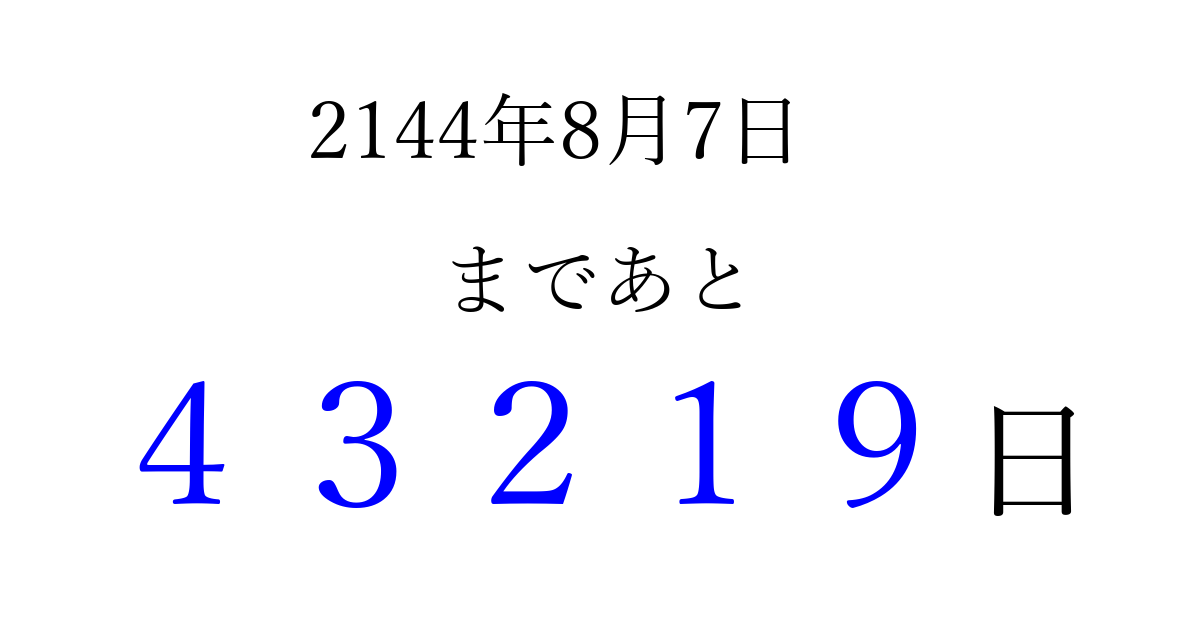 2144年8月7日(金)まで あと 99999 日です 追加すると、トップページからすぐ選べるようになります ※2026/04/09現在の結果です。 最新の状態に更新する ↓シェアして、タイムライン上にカウントダウンを表示しよう!↓ 📤 この結果を共有する Tweet シェア Threads Bluesky 別の日付でカウントダウン 2144年8月のカレンダー このページをブックマークに追加すると、いつでもカウントダウンを確認できます。 (PC: Ctrl+D / Mac: ⌘+D) hitome-notes.comでは以下のページも運営しています。 指定日と期間から日付を計算 | ガチャ確率計算・シミュレーション | プライバシー・ポリシー 運営者:Avocado