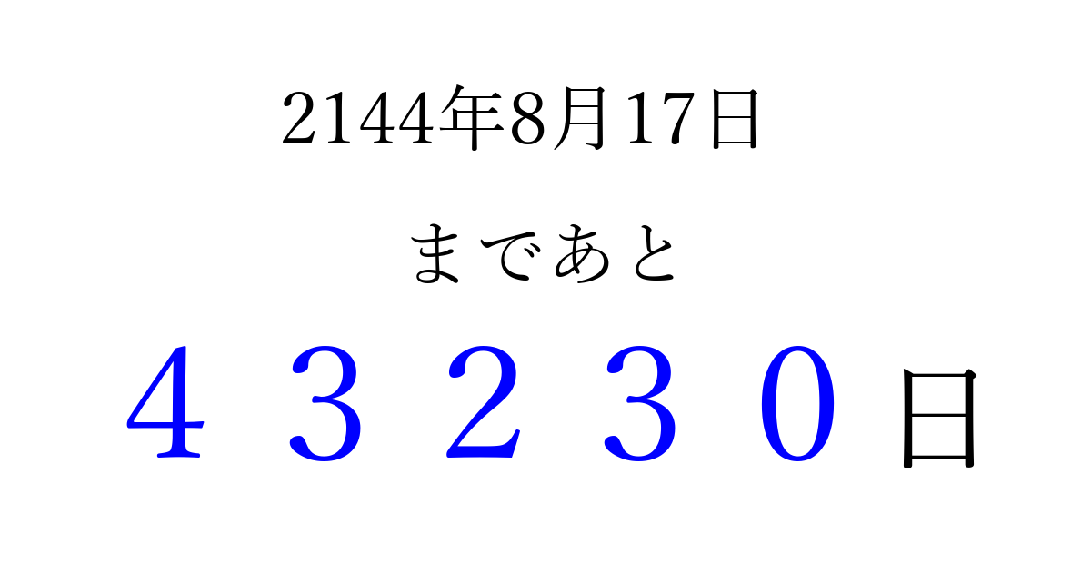 2144年8月17日(月)まで あと 99999 日です 追加すると、トップページからすぐ選べるようになります ※2026/04/08現在の結果です。 最新の状態に更新する ↓シェアして、タイムライン上にカウントダウンを表示しよう!↓ 📤 この結果を共有する Tweet シェア Threads Bluesky 別の日付でカウントダウン 2144年8月のカレンダー このページをブックマークに追加すると、いつでもカウントダウンを確認できます。 (PC: Ctrl+D / Mac: ⌘+D) hitome-notes.comでは以下のページも運営しています。 指定日と期間から日付を計算 | ガチャ確率計算・シミュレーション | プライバシー・ポリシー 運営者:Avocado