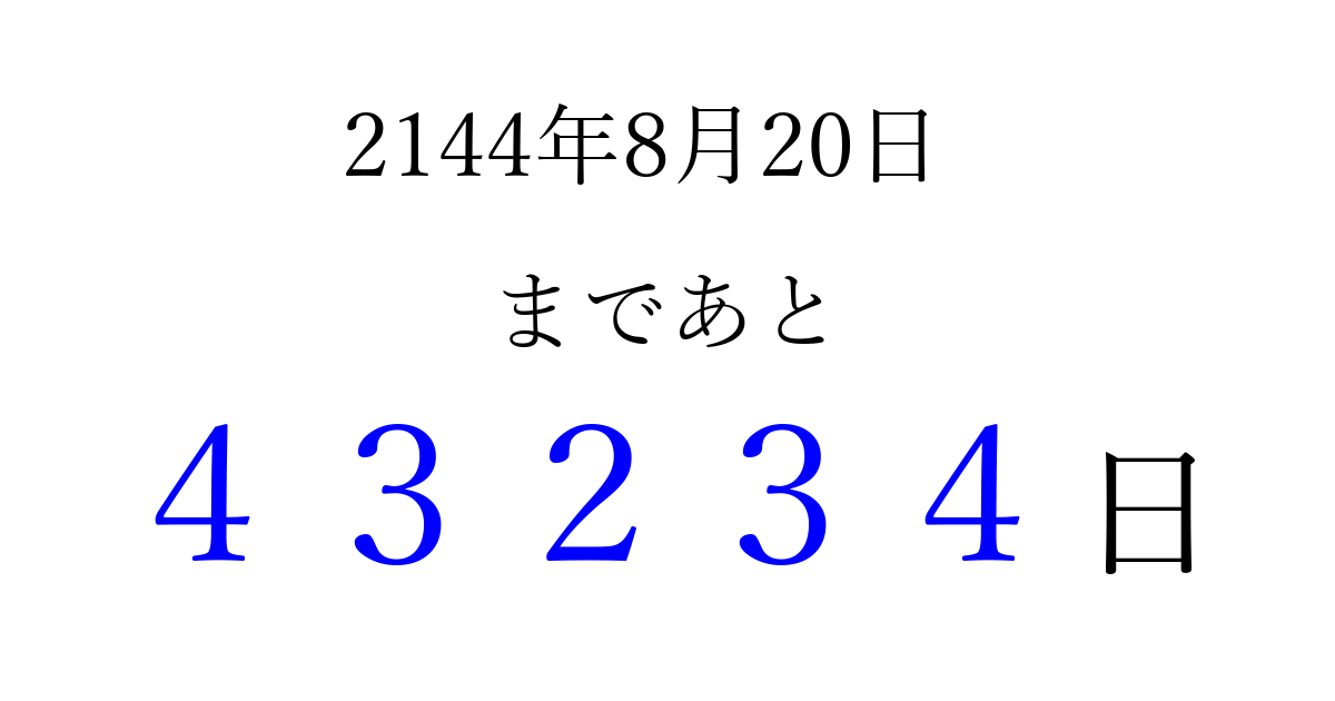 2144年8月20日(木)まで あと 99999 日です 追加すると、トップページからすぐ選べるようになります ※2026/04/07現在の結果です。 最新の状態に更新する ↓シェアして、タイムライン上にカウントダウンを表示しよう!↓ 📤 この結果を共有する Tweet シェア Threads Bluesky 別の日付でカウントダウン 2144年8月のカレンダー このページをブックマークに追加すると、いつでもカウントダウンを確認できます。 (PC: Ctrl+D / Mac: ⌘+D) hitome-notes.comでは以下のページも運営しています。 指定日と期間から日付を計算 | ガチャ確率計算・シミュレーション | プライバシー・ポリシー 運営者:Avocado