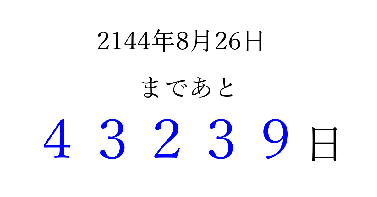2144年8月26日(水)まで あと 99999 日です 追加すると、トップページからすぐ選べるようになります ※2026/04/08現在の結果です。 最新の状態に更新する ↓シェアして、タイムライン上にカウントダウンを表示しよう!↓ 📤 この結果を共有する Tweet シェア Threads Bluesky 別の日付でカウントダウン 2144年8月のカレンダー このページをブックマークに追加すると、いつでもカウントダウンを確認できます。 (PC: Ctrl+D / Mac: ⌘+D) hitome-notes.comでは以下のページも運営しています。 指定日と期間から日付を計算 | ガチャ確率計算・シミュレーション | プライバシー・ポリシー 運営者:Avocado