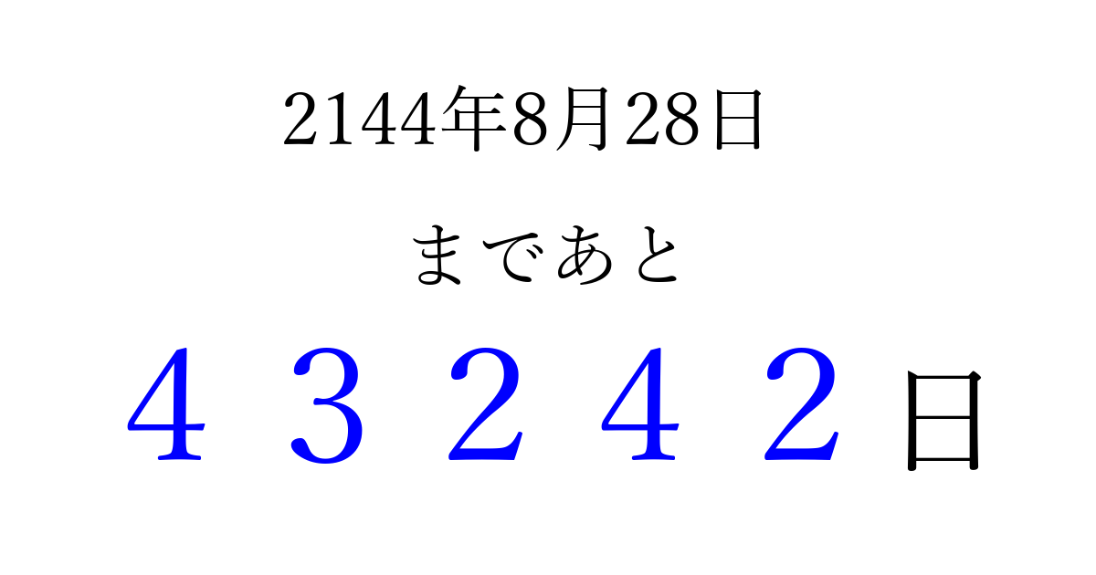 2144年8月28日(金)まで あと 99999 日です 追加すると、トップページからすぐ選べるようになります ※2026/04/07現在の結果です。 最新の状態に更新する ↓シェアして、タイムライン上にカウントダウンを表示しよう!↓ 📤 この結果を共有する Tweet シェア Threads Bluesky 別の日付でカウントダウン 2144年8月のカレンダー このページをブックマークに追加すると、いつでもカウントダウンを確認できます。 (PC: Ctrl+D / Mac: ⌘+D) hitome-notes.comでは以下のページも運営しています。 指定日と期間から日付を計算 | ガチャ確率計算・シミュレーション | プライバシー・ポリシー 運営者:Avocado