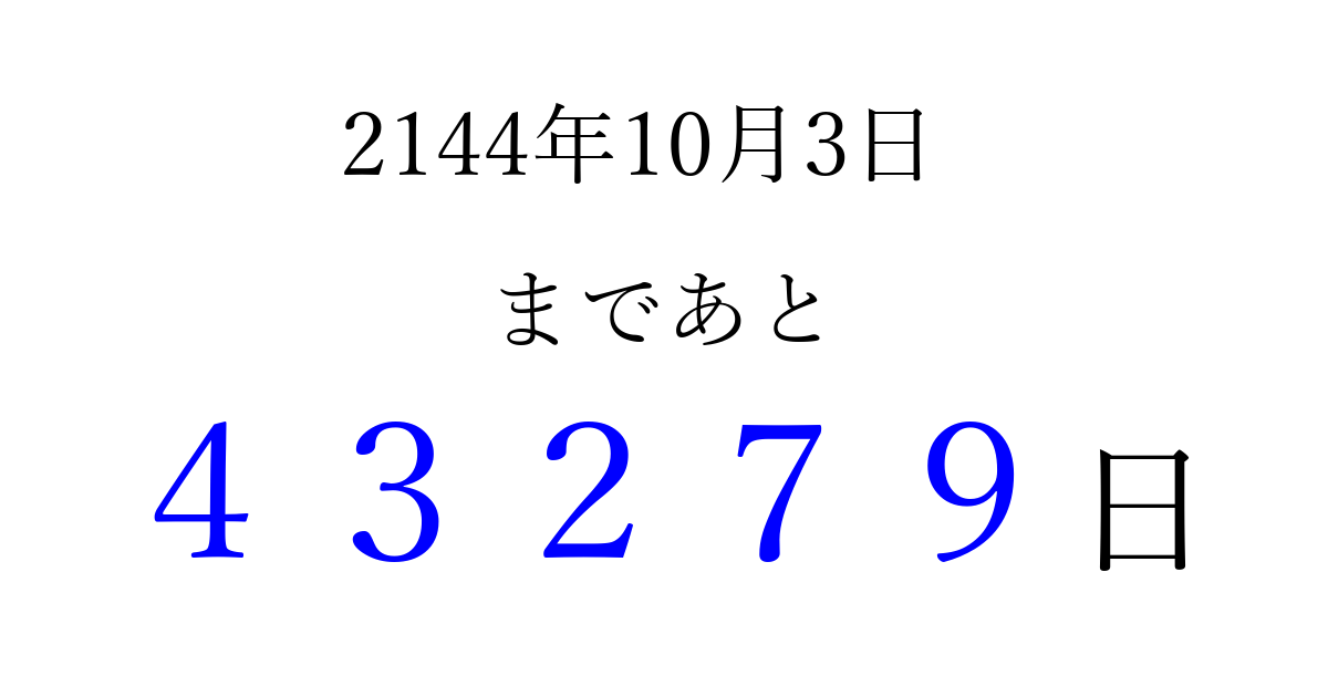 2144年10月3日(土)まで あと 99999 日です 追加すると、トップページからすぐ選べるようになります ※2026/04/06現在の結果です。 最新の状態に更新する ↓シェアして、タイムライン上にカウントダウンを表示しよう!↓ 📤 この結果を共有する Tweet シェア Threads Bluesky 別の日付でカウントダウン 2144年10月のカレンダー このページをブックマークに追加すると、いつでもカウントダウンを確認できます。 (PC: Ctrl+D / Mac: ⌘+D) hitome-notes.comでは以下のページも運営しています。 指定日と期間から日付を計算 | ガチャ確率計算・シミュレーション | プライバシー・ポリシー 運営者:Avocado