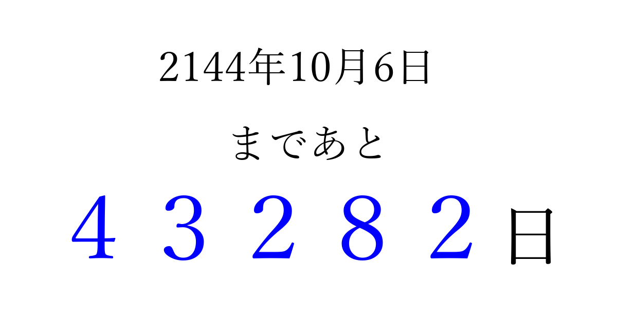 2144年10月6日(火)まで あと 99999 日です 追加すると、トップページからすぐ選べるようになります ※2026/04/06現在の結果です。 最新の状態に更新する ↓シェアして、タイムライン上にカウントダウンを表示しよう!↓ 📤 この結果を共有する Tweet シェア Threads Bluesky 別の日付でカウントダウン 2144年10月のカレンダー このページをブックマークに追加すると、いつでもカウントダウンを確認できます。 (PC: Ctrl+D / Mac: ⌘+D) hitome-notes.comでは以下のページも運営しています。 指定日と期間から日付を計算 | ガチャ確率計算・シミュレーション | プライバシー・ポリシー 運営者:Avocado