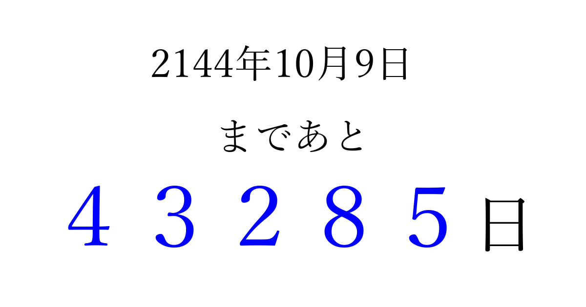 2144年10月9日(金)まで あと 99999 日です 追加すると、トップページからすぐ選べるようになります ※2026/04/06現在の結果です。 最新の状態に更新する ↓シェアして、タイムライン上にカウントダウンを表示しよう!↓ 📤 この結果を共有する Tweet シェア Threads Bluesky 別の日付でカウントダウン 2144年10月のカレンダー このページをブックマークに追加すると、いつでもカウントダウンを確認できます。 (PC: Ctrl+D / Mac: ⌘+D) hitome-notes.comでは以下のページも運営しています。 指定日と期間から日付を計算 | ガチャ確率計算・シミュレーション | プライバシー・ポリシー 運営者:Avocado