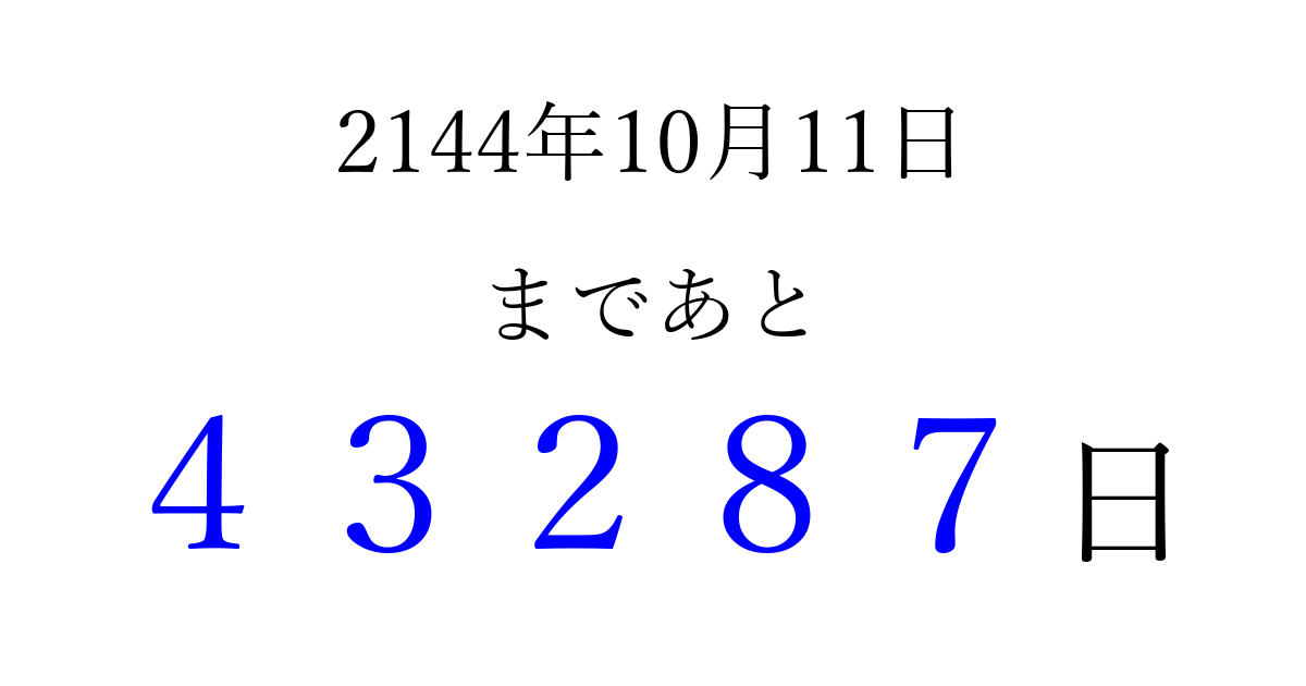 2144年10月11日(日)まで あと 99999 日です 追加すると、トップページからすぐ選べるようになります ※2026/04/06現在の結果です。 最新の状態に更新する ↓シェアして、タイムライン上にカウントダウンを表示しよう!↓ 📤 この結果を共有する Tweet シェア Threads Bluesky 別の日付でカウントダウン 2144年10月のカレンダー このページをブックマークに追加すると、いつでもカウントダウンを確認できます。 (PC: Ctrl+D / Mac: ⌘+D) hitome-notes.comでは以下のページも運営しています。 指定日と期間から日付を計算 | ガチャ確率計算・シミュレーション | プライバシー・ポリシー 運営者:Avocado