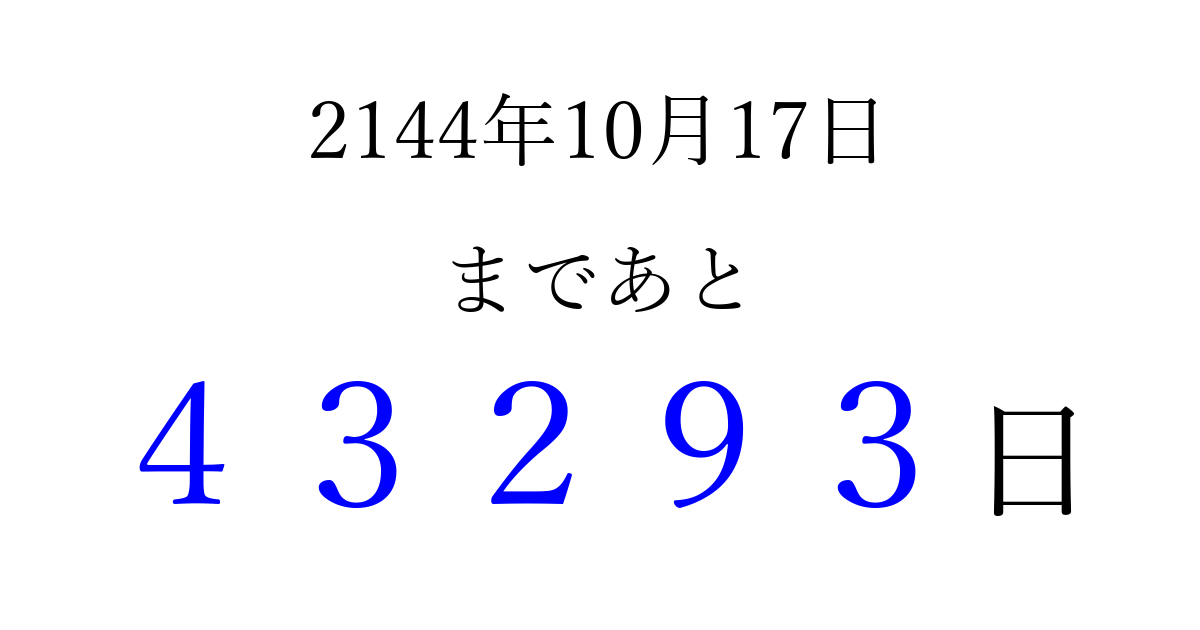 2144年10月17日(土)まで あと 99999 日です 追加すると、トップページからすぐ選べるようになります ※2026/04/06現在の結果です。 最新の状態に更新する ↓シェアして、タイムライン上にカウントダウンを表示しよう!↓ 📤 この結果を共有する Tweet シェア Threads Bluesky 別の日付でカウントダウン 2144年10月のカレンダー このページをブックマークに追加すると、いつでもカウントダウンを確認できます。 (PC: Ctrl+D / Mac: ⌘+D) hitome-notes.comでは以下のページも運営しています。 指定日と期間から日付を計算 | ガチャ確率計算・シミュレーション | プライバシー・ポリシー 運営者:Avocado