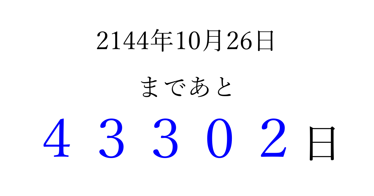 2144年10月26日(月)まで あと 99999 日です 追加すると、トップページからすぐ選べるようになります ※2026/04/06現在の結果です。 最新の状態に更新する ↓シェアして、タイムライン上にカウントダウンを表示しよう!↓ 📤 この結果を共有する Tweet シェア Threads Bluesky 別の日付でカウントダウン 2144年10月のカレンダー このページをブックマークに追加すると、いつでもカウントダウンを確認できます。 (PC: Ctrl+D / Mac: ⌘+D) hitome-notes.comでは以下のページも運営しています。 指定日と期間から日付を計算 | ガチャ確率計算・シミュレーション | プライバシー・ポリシー 運営者:Avocado