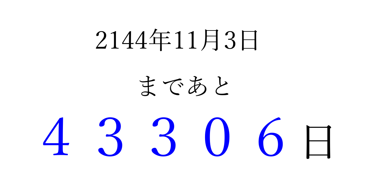 2144年11月3日(火)まで あと 99999 日です 追加すると、トップページからすぐ選べるようになります ※2026/04/10現在の結果です。 最新の状態に更新する ↓シェアして、タイムライン上にカウントダウンを表示しよう!↓ 📤 この結果を共有する Tweet シェア Threads Bluesky 別の日付でカウントダウン 2144年11月のカレンダー このページをブックマークに追加すると、いつでもカウントダウンを確認できます。 (PC: Ctrl+D / Mac: ⌘+D) hitome-notes.comでは以下のページも運営しています。 指定日と期間から日付を計算 | ガチャ確率計算・シミュレーション | プライバシー・ポリシー 運営者:Avocado