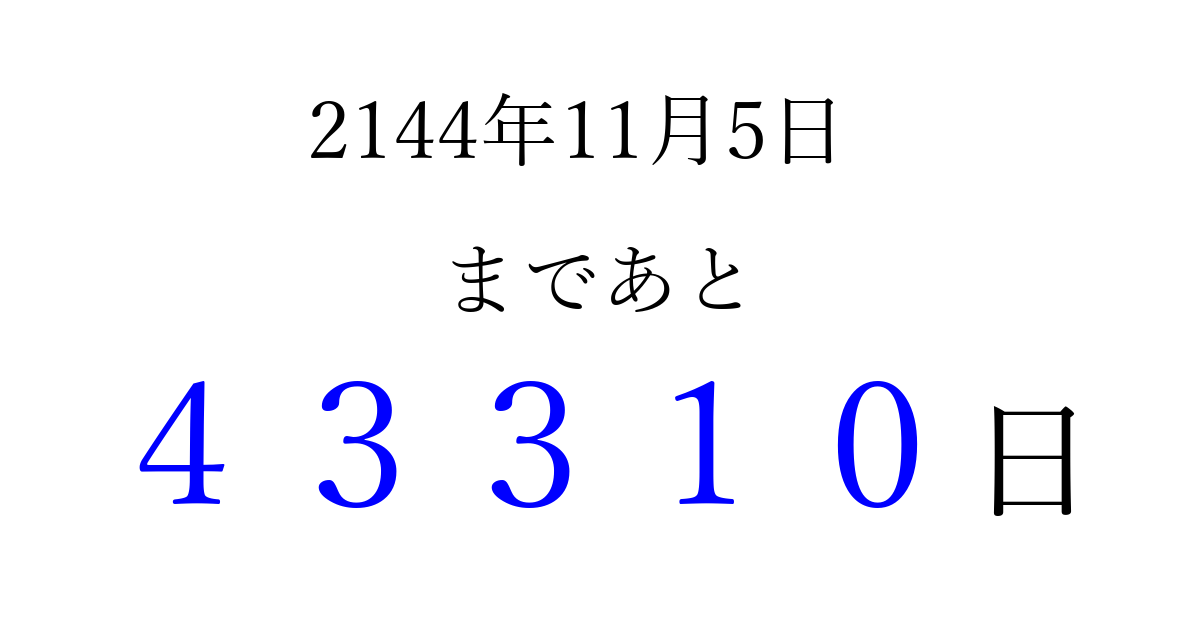 2144年11月5日(木)まで あと 99999 日です 追加すると、トップページからすぐ選べるようになります ※2026/04/08現在の結果です。 最新の状態に更新する ↓シェアして、タイムライン上にカウントダウンを表示しよう!↓ 📤 この結果を共有する Tweet シェア Threads Bluesky 別の日付でカウントダウン 2144年11月のカレンダー このページをブックマークに追加すると、いつでもカウントダウンを確認できます。 (PC: Ctrl+D / Mac: ⌘+D) hitome-notes.comでは以下のページも運営しています。 指定日と期間から日付を計算 | ガチャ確率計算・シミュレーション | プライバシー・ポリシー 運営者:Avocado