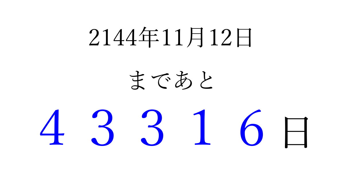 2144年11月12日(木)まで あと 99999 日です 追加すると、トップページからすぐ選べるようになります ※2026/04/09現在の結果です。 最新の状態に更新する ↓シェアして、タイムライン上にカウントダウンを表示しよう!↓ 📤 この結果を共有する Tweet シェア Threads Bluesky 別の日付でカウントダウン 2144年11月のカレンダー このページをブックマークに追加すると、いつでもカウントダウンを確認できます。 (PC: Ctrl+D / Mac: ⌘+D) hitome-notes.comでは以下のページも運営しています。 指定日と期間から日付を計算 | ガチャ確率計算・シミュレーション | プライバシー・ポリシー 運営者:Avocado