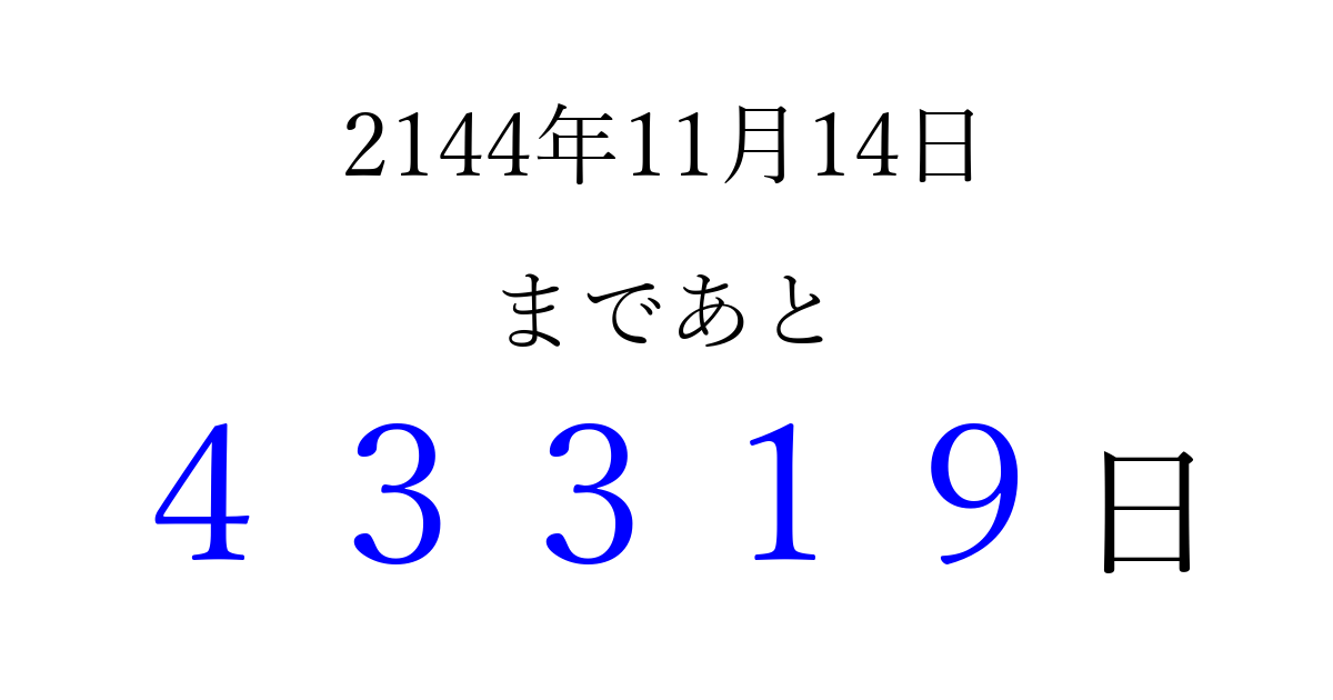 2144年11月14日(土)まで あと 99999 日です 追加すると、トップページからすぐ選べるようになります ※2026/04/08現在の結果です。 最新の状態に更新する ↓シェアして、タイムライン上にカウントダウンを表示しよう!↓ 📤 この結果を共有する Tweet シェア Threads Bluesky 別の日付でカウントダウン 2144年11月のカレンダー このページをブックマークに追加すると、いつでもカウントダウンを確認できます。 (PC: Ctrl+D / Mac: ⌘+D) hitome-notes.comでは以下のページも運営しています。 指定日と期間から日付を計算 | ガチャ確率計算・シミュレーション | プライバシー・ポリシー 運営者:Avocado