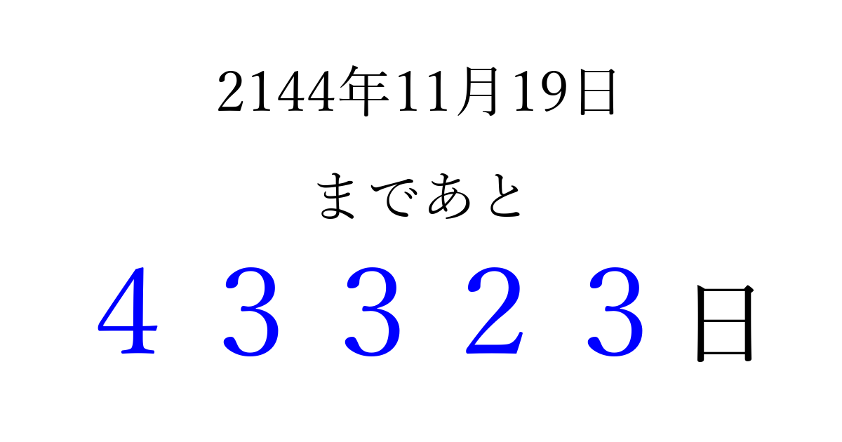 2144年11月19日(木)まで あと 99999 日です 追加すると、トップページからすぐ選べるようになります ※2026/04/09現在の結果です。 最新の状態に更新する ↓シェアして、タイムライン上にカウントダウンを表示しよう!↓ 📤 この結果を共有する Tweet シェア Threads Bluesky 別の日付でカウントダウン 2144年11月のカレンダー このページをブックマークに追加すると、いつでもカウントダウンを確認できます。 (PC: Ctrl+D / Mac: ⌘+D) hitome-notes.comでは以下のページも運営しています。 指定日と期間から日付を計算 | ガチャ確率計算・シミュレーション | プライバシー・ポリシー 運営者:Avocado