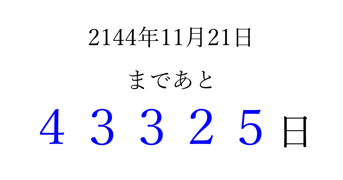 2144年11月21日(土)まで あと 99999 日です 追加すると、トップページからすぐ選べるようになります ※2026/04/09現在の結果です。 最新の状態に更新する ↓シェアして、タイムライン上にカウントダウンを表示しよう!↓ 📤 この結果を共有する Tweet シェア Threads Bluesky 別の日付でカウントダウン 2144年11月のカレンダー このページをブックマークに追加すると、いつでもカウントダウンを確認できます。 (PC: Ctrl+D / Mac: ⌘+D) hitome-notes.comでは以下のページも運営しています。 指定日と期間から日付を計算 | ガチャ確率計算・シミュレーション | プライバシー・ポリシー 運営者:Avocado