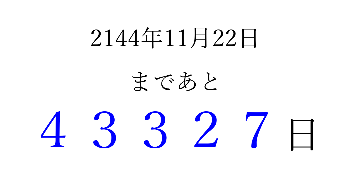 2144年11月22日(日)まで あと 99999 日です 追加すると、トップページからすぐ選べるようになります ※2026/04/08現在の結果です。 最新の状態に更新する ↓シェアして、タイムライン上にカウントダウンを表示しよう!↓ 📤 この結果を共有する Tweet シェア Threads Bluesky 別の日付でカウントダウン 2144年11月のカレンダー このページをブックマークに追加すると、いつでもカウントダウンを確認できます。 (PC: Ctrl+D / Mac: ⌘+D) hitome-notes.comでは以下のページも運営しています。 指定日と期間から日付を計算 | ガチャ確率計算・シミュレーション | プライバシー・ポリシー 運営者:Avocado