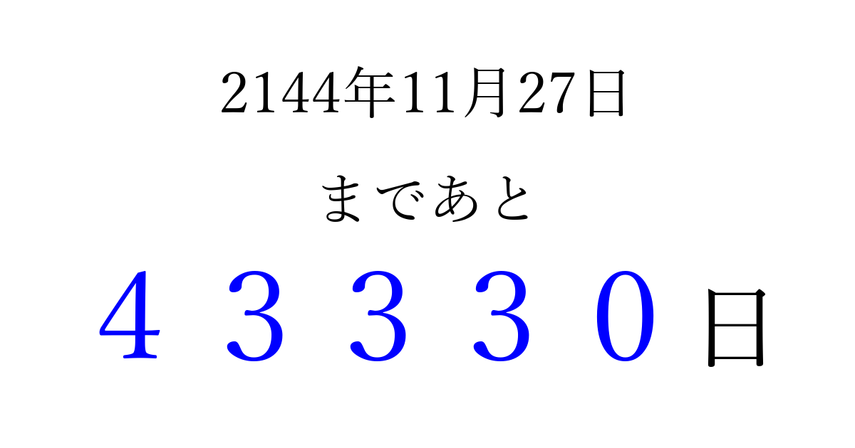 2144年11月27日(金)まで あと 99999 日です 追加すると、トップページからすぐ選べるようになります ※2026/04/10現在の結果です。 最新の状態に更新する ↓シェアして、タイムライン上にカウントダウンを表示しよう!↓ 📤 この結果を共有する Tweet シェア Threads Bluesky 別の日付でカウントダウン 2144年11月のカレンダー このページをブックマークに追加すると、いつでもカウントダウンを確認できます。 (PC: Ctrl+D / Mac: ⌘+D) hitome-notes.comでは以下のページも運営しています。 指定日と期間から日付を計算 | ガチャ確率計算・シミュレーション | プライバシー・ポリシー 運営者:Avocado