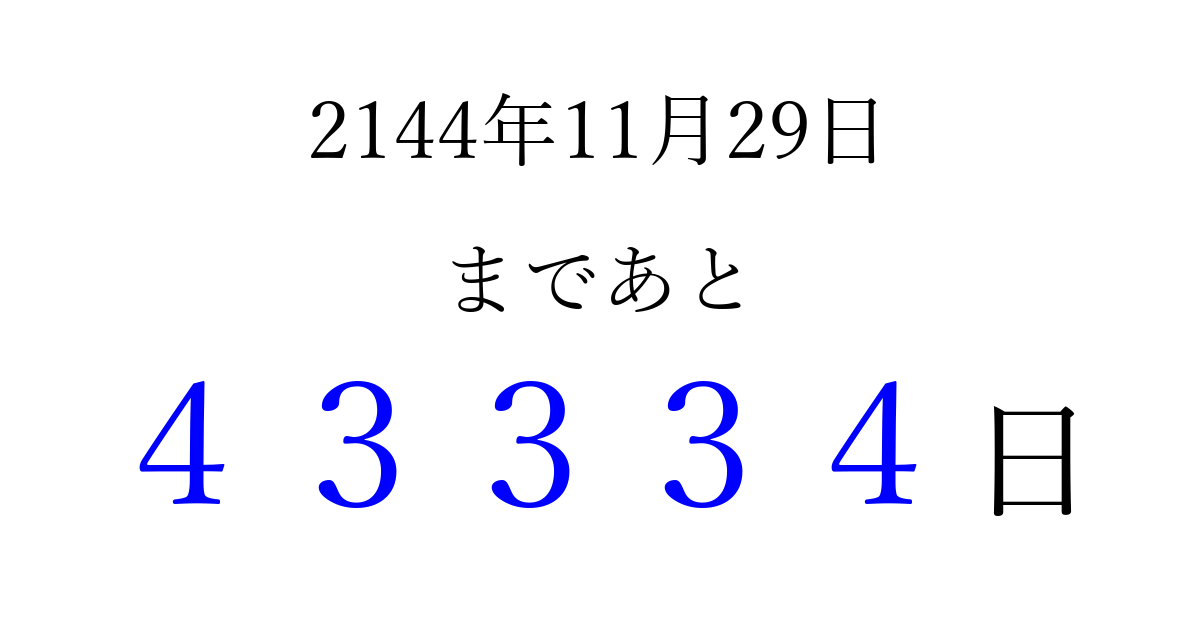 2144年11月29日(日)まで あと 99999 日です 追加すると、トップページからすぐ選べるようになります ※2026/04/08現在の結果です。 最新の状態に更新する ↓シェアして、タイムライン上にカウントダウンを表示しよう!↓ 📤 この結果を共有する Tweet シェア Threads Bluesky 別の日付でカウントダウン 2144年11月のカレンダー このページをブックマークに追加すると、いつでもカウントダウンを確認できます。 (PC: Ctrl+D / Mac: ⌘+D) hitome-notes.comでは以下のページも運営しています。 指定日と期間から日付を計算 | ガチャ確率計算・シミュレーション | プライバシー・ポリシー 運営者:Avocado
